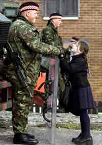 | | LOOKING FOR PEACE: A young girl talks to a British Army soldier on patrol in the Ardoyne road in Belfast, October 24, 2001. The British government responded swiftly to the IRA's decision to disarm, saying it would tear down four key security installations in N.Ireland as soon as possible. [Reuters] |