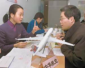 | | Nick Chen, a Taiwanese working in Shanghai, books his charter flight ticket with Taiwan-based China Airlines on Friday to guarantee a speedy trip back to Taiwan for the Spring Festival holiday. Six Taiwan carriers have been given the go-ahead to provide unprecedented charter services, during the festival, for Taiwanese working or living in the Chinese mainland. [newsphoto.com.cn] |