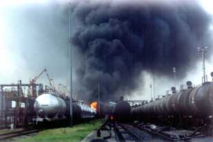 fire caused by the oil-tank train explosion in Xi'an, July 23, 2003.