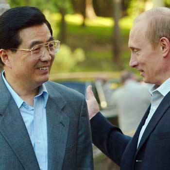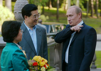 Chinese President Hu Jintao (left) speaks with Russian President Vladimir Putin prior to an informal dinner at Putin's residence in Novo-Ogaryovo outside Moscow on May 26, 2003. President Hu arriv