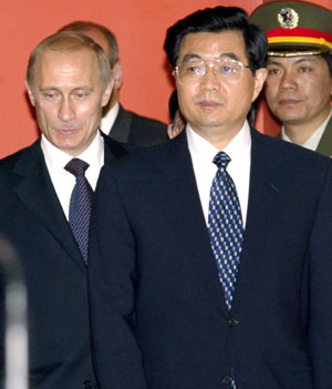 Chinese President Hu Jintao and Russian President Vladimir Putin enter the conference hall ahead of their meeting in Moscow Tuesday. The two leaders vowed to continue to adhere to the principles a