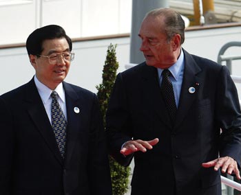 Chinese President Hu Jintoa (L)speaks with French President Jacques Chirac (R) after arriving in Evian, France from Switzerland by ferry boat, June 1, 2003. France is hosting the annual G8 summit