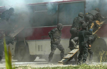 | | | | | | | | | | | | |  | | | Soliders storm a bus "hijacked" by "terrorists" in the second phase of the Shanghai Cooperation Organization (SCO)'s joint military exercise in Yili, Northwest China's Xinjiang Uygur Autonomous Region August 11, 2003. More than 1,000 officers and soldiers from SCO's five member states, including China and Russia, take part in the anti-terrorism maneuver. The first phase of the drill was held in Kazakhstan's border city of Ucharal.[Xinhua] | | | | | | | | | | | | |  | | | The second phase of the Shanghai Cooperation Organization (SCO)'s joint military exercise kickstarts in Yili, Northwest China's Xinjiang Uygur Autonomous Region August 11, 2003. More than 1,000 officers and soldiers from SCO's five member states, including China and Russia, take part in the anti-terrorism maneuver. The first phase of the drill was held in Kazakhstan's border city of Ucharal.[Xinhua]