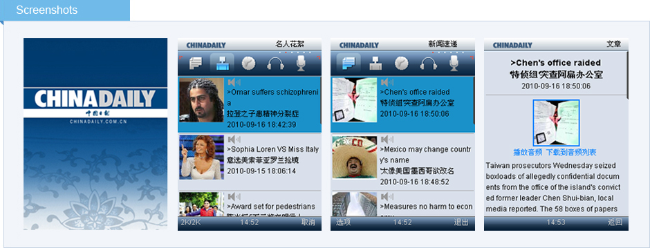 “ChinaDaily雙語聽報”內(nèi)容包含當天要聞、明星八卦、體育賽事、英語熱詞等內(nèi)容。所有內(nèi)容均配有外籍專家的標準音頻,每日讓您獲得權威實時雙語資訊的同時,更讓您輕松掌握大量新詞匯并提高英語閱讀能力。 |